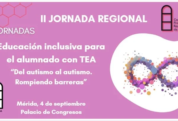 La II Jornada Regional Educación Inclusiva para el alumnado con TEA: Del autismo al autismo. Rompiendo barreras, se celebrará en Mérida el 4 de septiembre de 2025 en horario de 9:00 a 14:00 horas en el Palacio de Congresos de Mérida